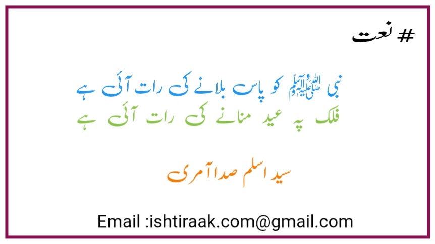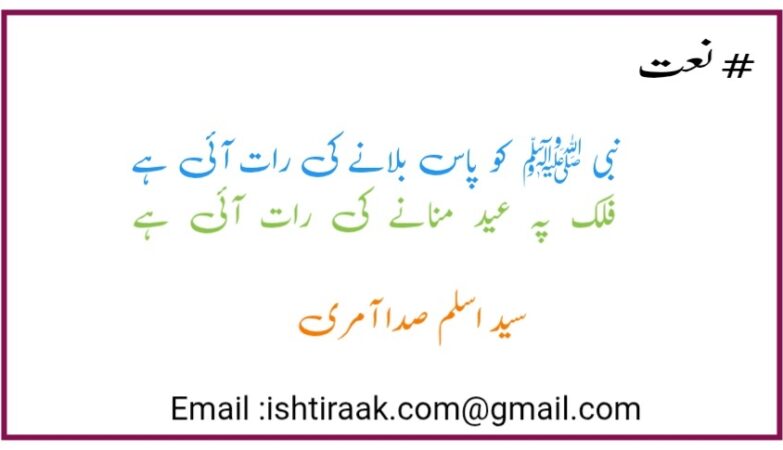 اثر خامہ: سید اسلم صدا آمری، چینائینبی ﷺ کو پاس بلانے کی رات آئی ہےفلک پہ عید منانے کی رات آئی ہےنظام شمس و قمر